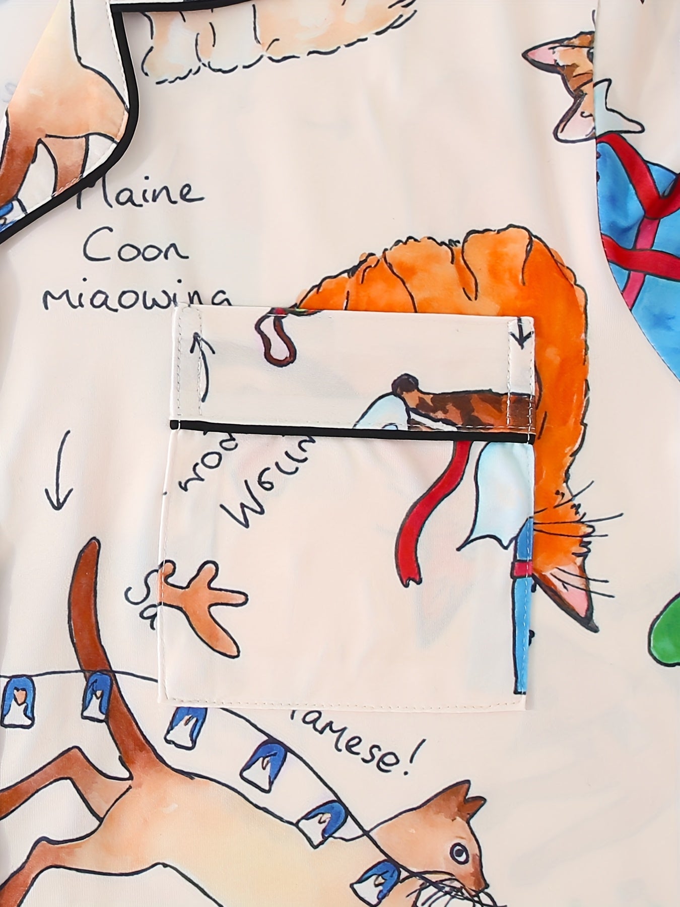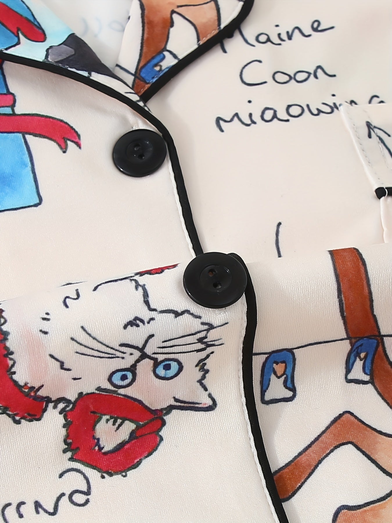 Bring joy and coziness to your nights with this 3-piece satin nightwear set, featuring fun doodle-style cat illustrations and playful festive elements. The set includes a button-up short-sleeve shirt, relaxed-fit shorts, and comfortable pajama pants, perfect for mixing and matching according to your mood.