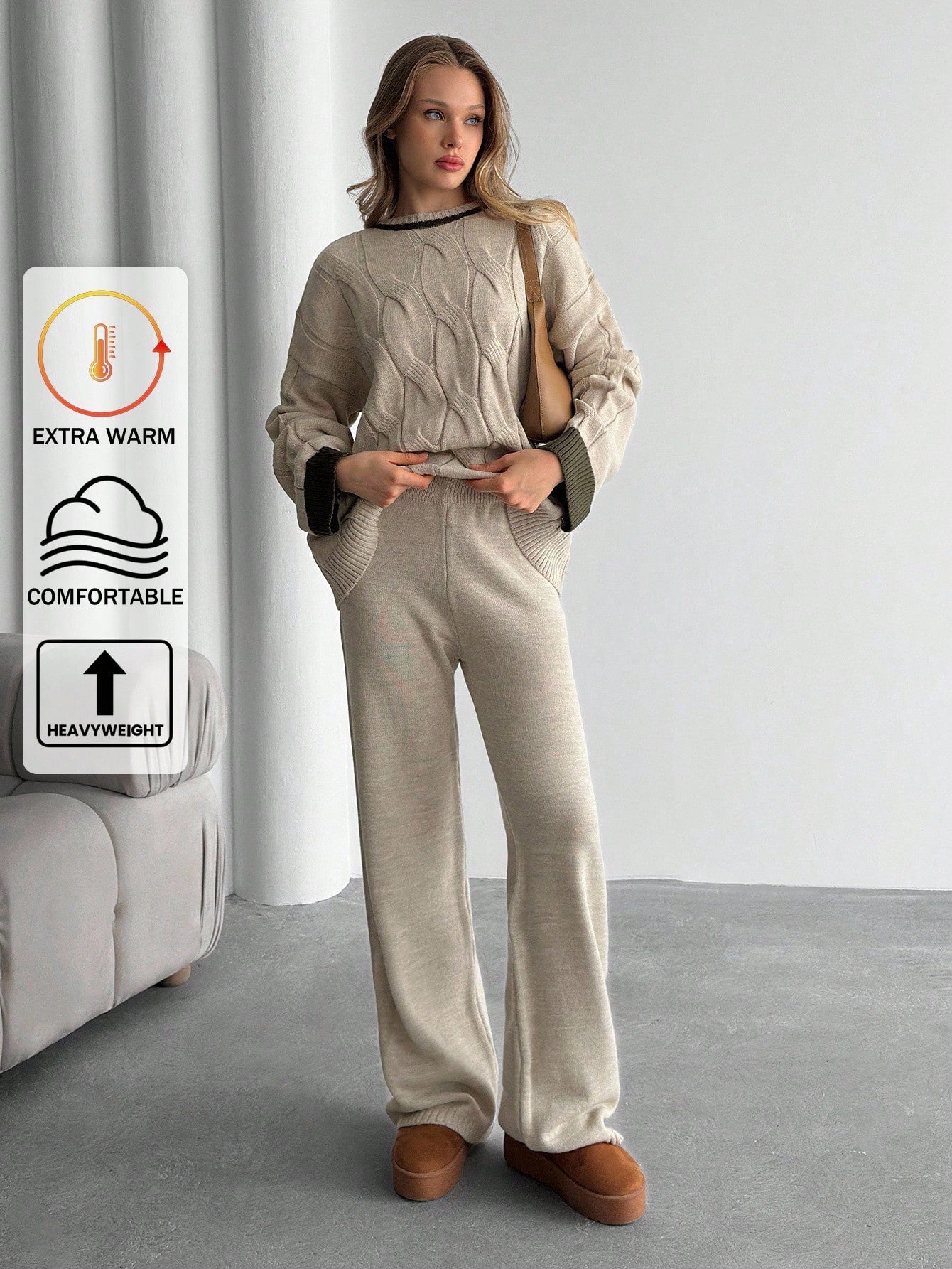 The Heavyweight Cable Knit Lounge Set is designed for maximum warmth and elevated comfort during colder days. This two-piece set features a plush, cable-knit sweater paired with matching straight-leg knit pants, delivering a refined silhouette with a cozy, substantial feel.