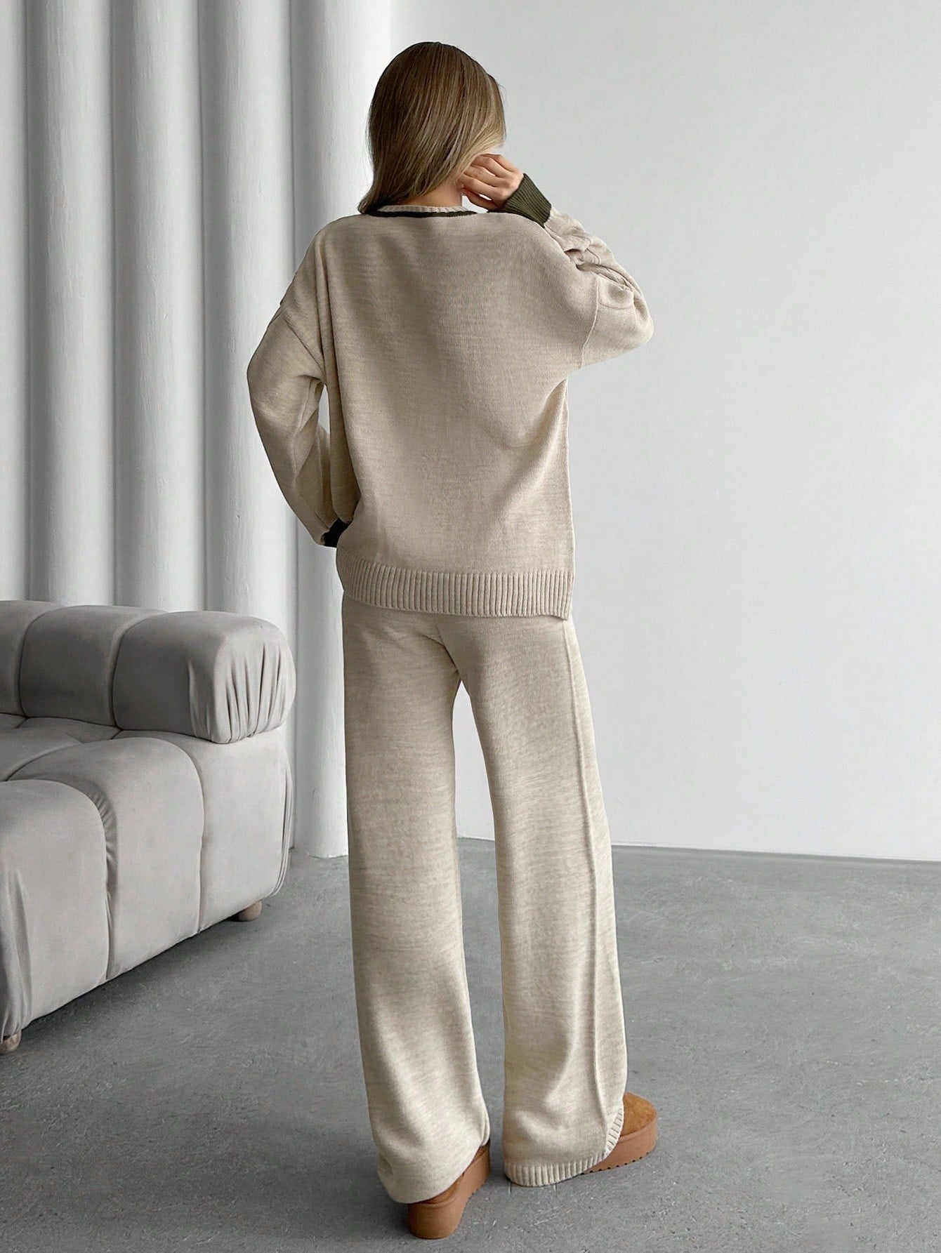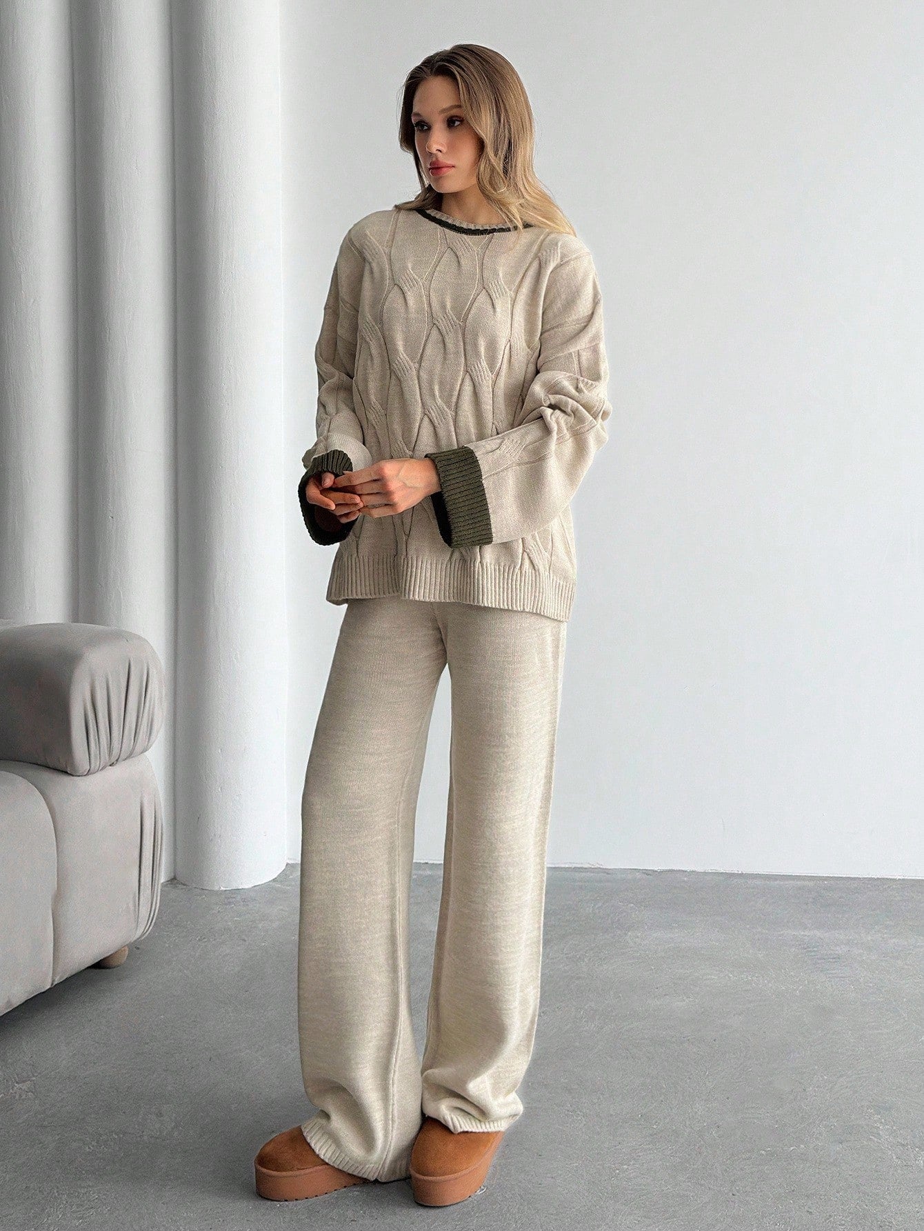 Crafted from a heavyweight knit, the sweater showcases textured cable detailing throughout, complemented by ribbed cuffs, hem, and neckline for a structured yet relaxed fit. The coordinating pants offer a smooth drape with a comfortable waistband, providing ease of movement without compromising style. Finished in a soft oatmeal tone, this set is ideal for lounging, travel, or polished off-duty wear when temperatures drop.