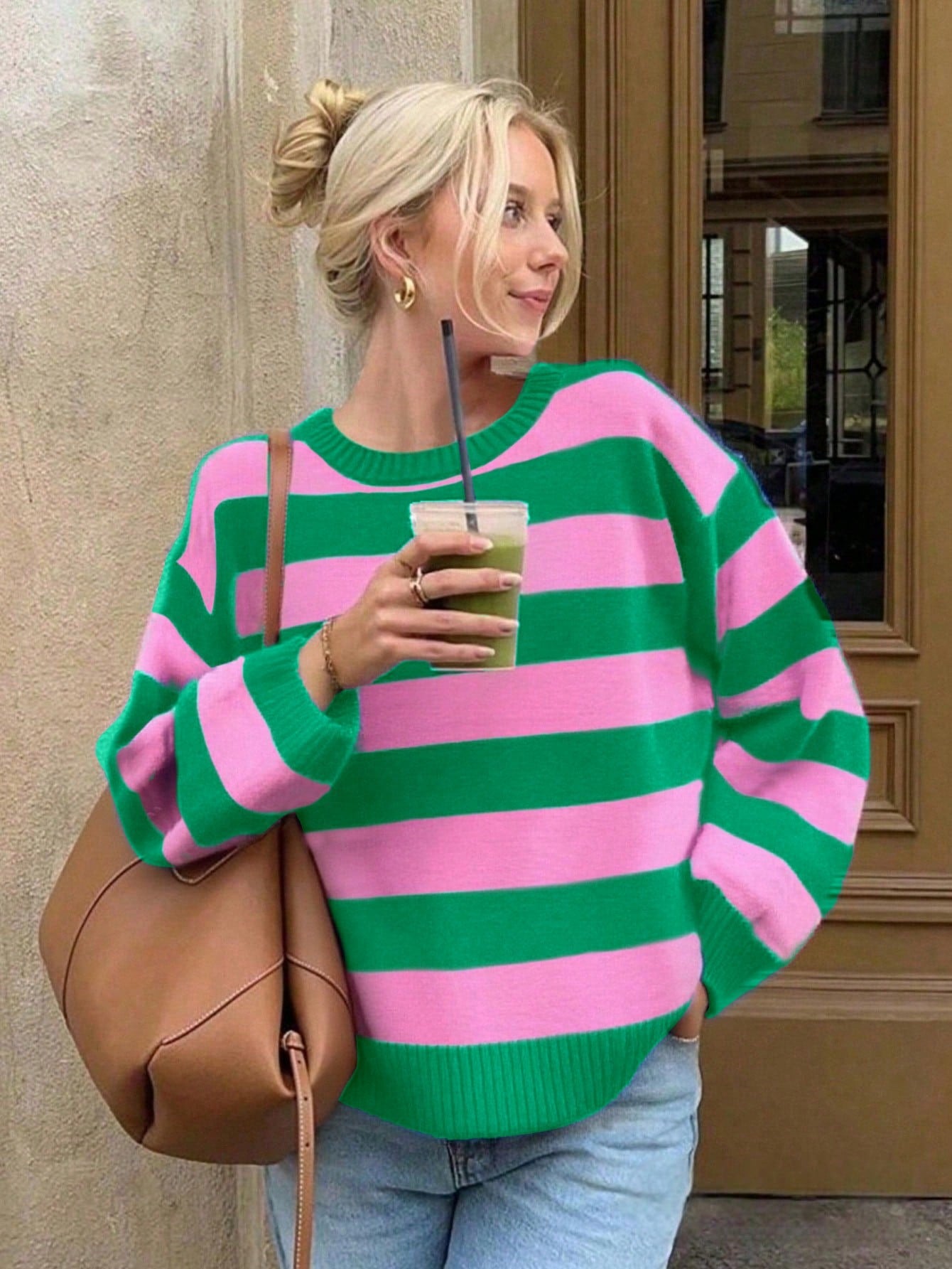 Make a confident style statement with this bold stripe knit pullover, designed to balance playful color with everyday versatility. Featuring wide horizontal stripes in vibrant green and soft pink, this sweater delivers a modern, fashion-forward look while remaining easy to wear. The relaxed silhouette, ribbed crew neckline, cuffs, and hem provide comfort and structure, making it ideal for layering or wearing on its own.
