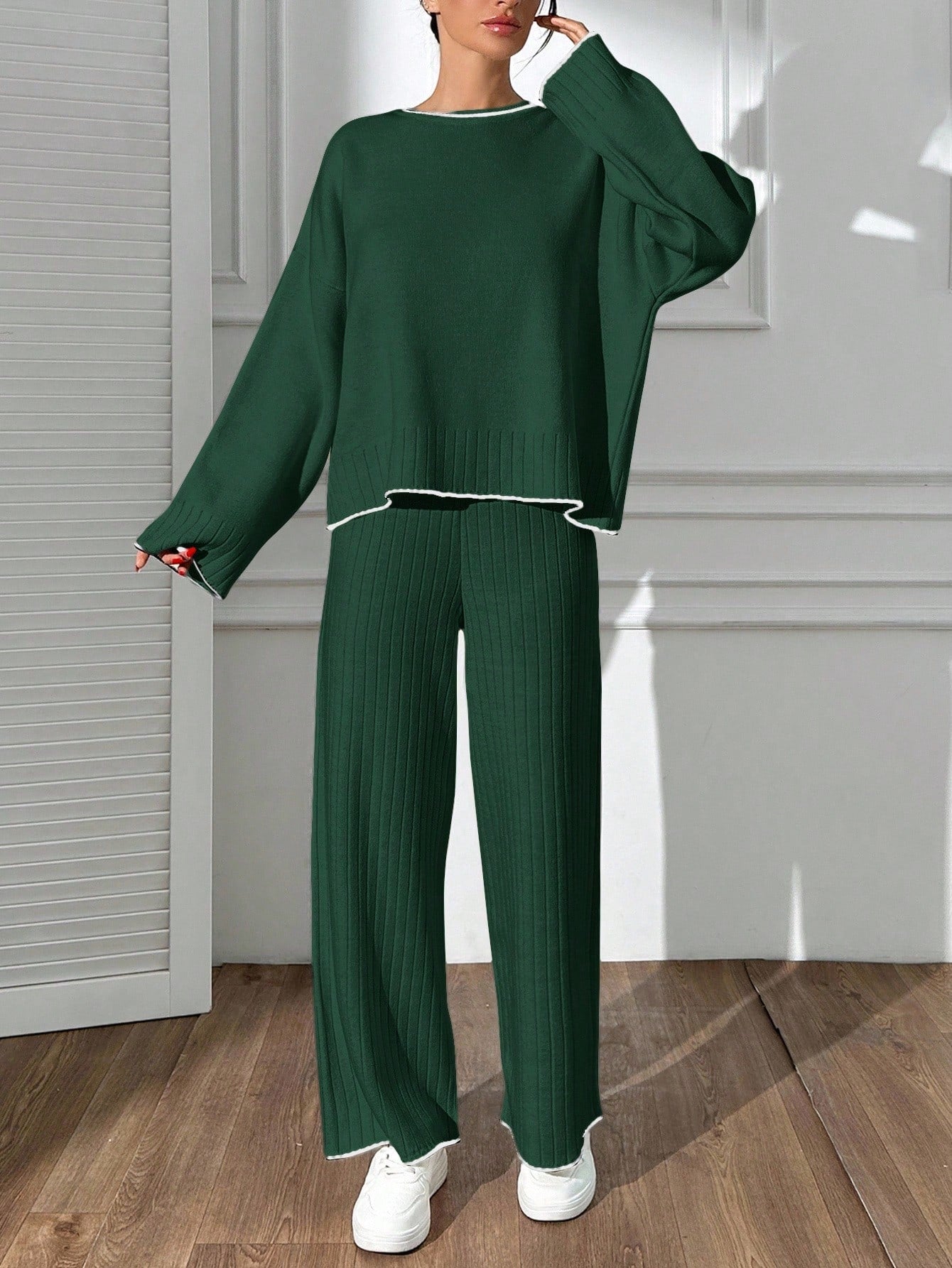 Contrast-Trim Ribbed Knit Lounge Set – Forest Green