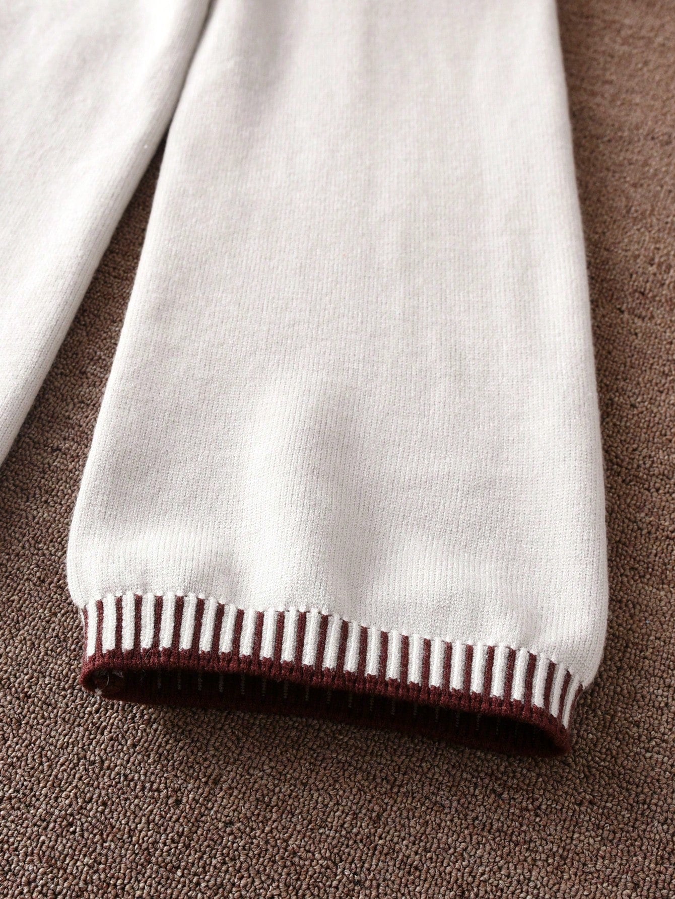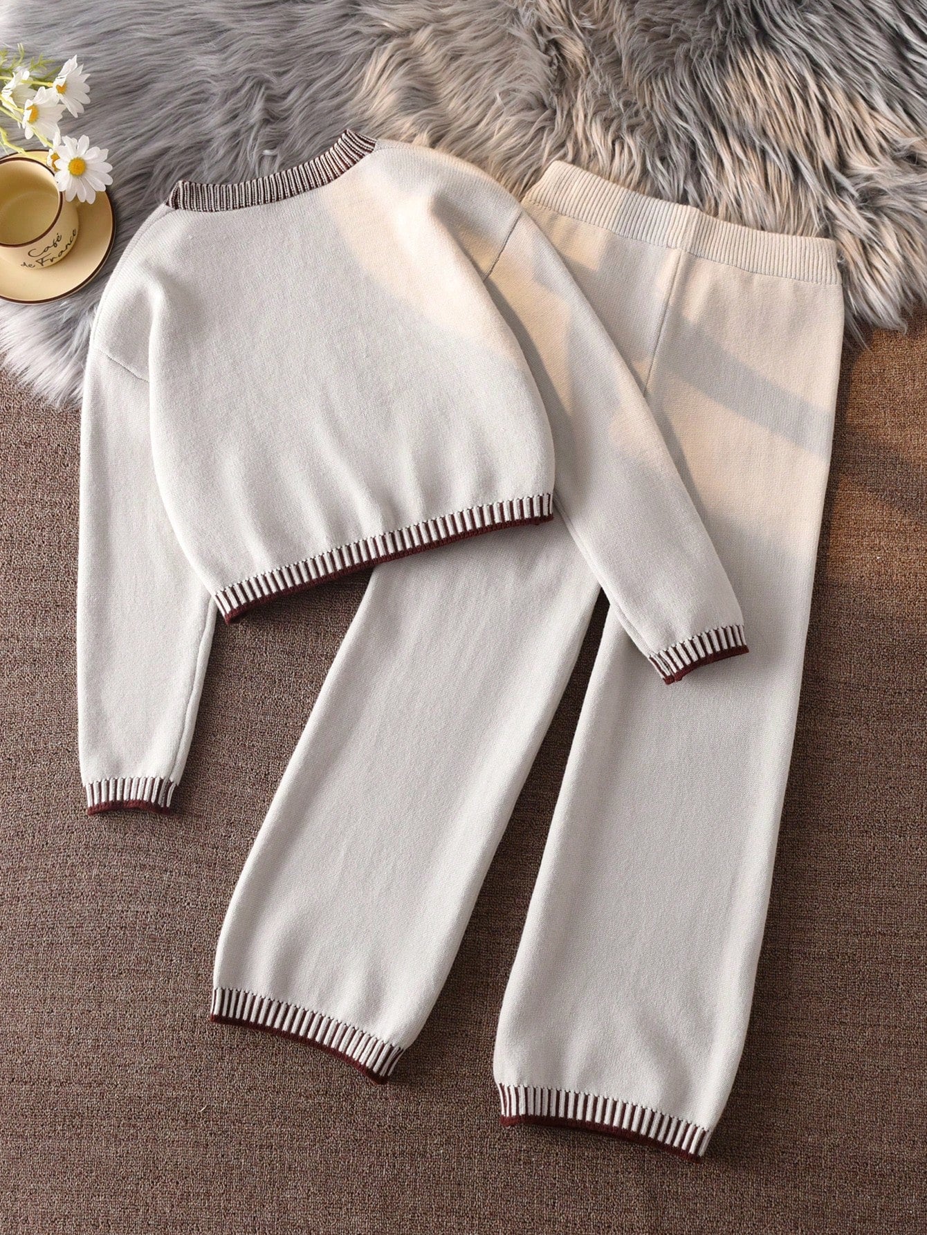 Contrast-Trim Knit Cardigan Lounge Set – Cream