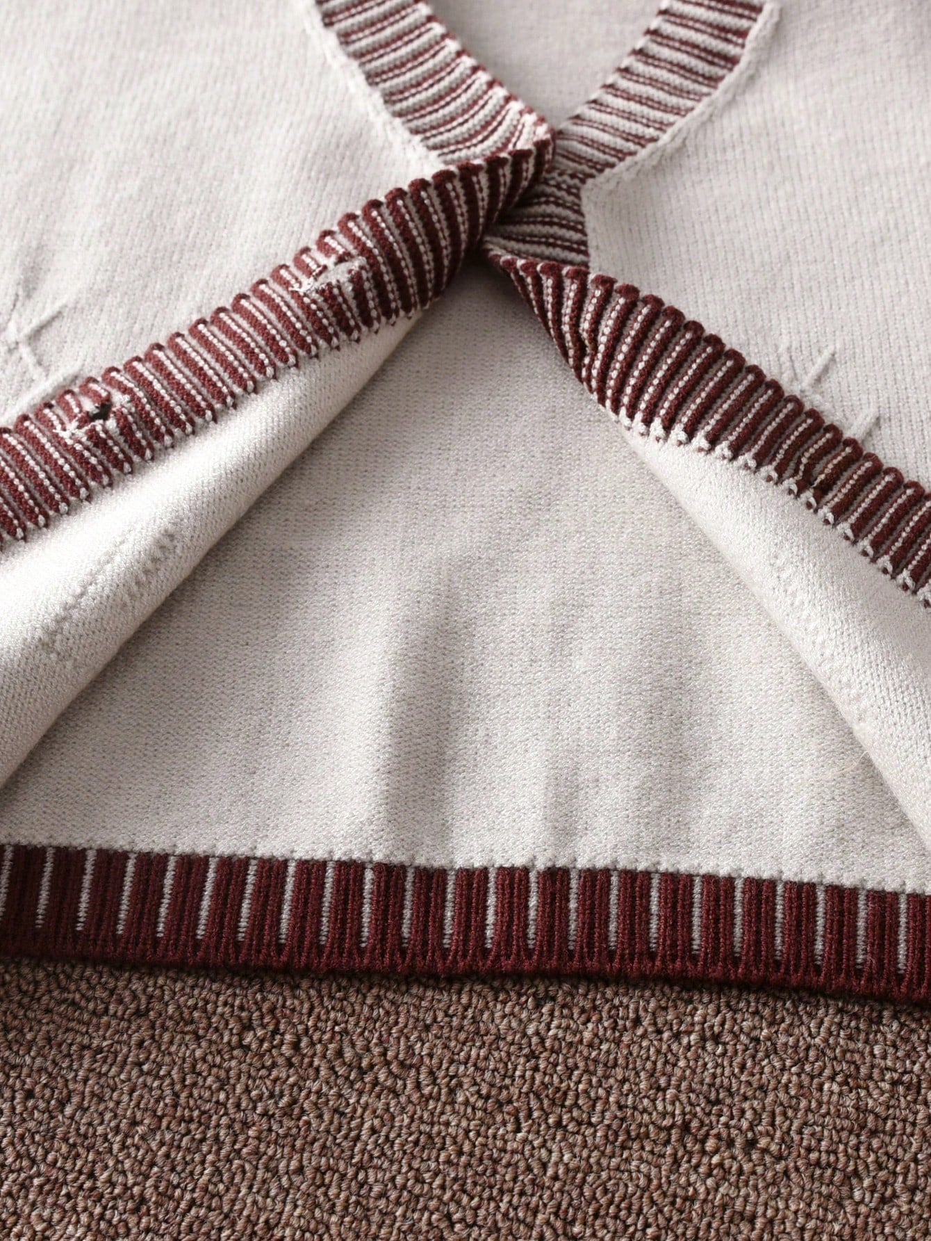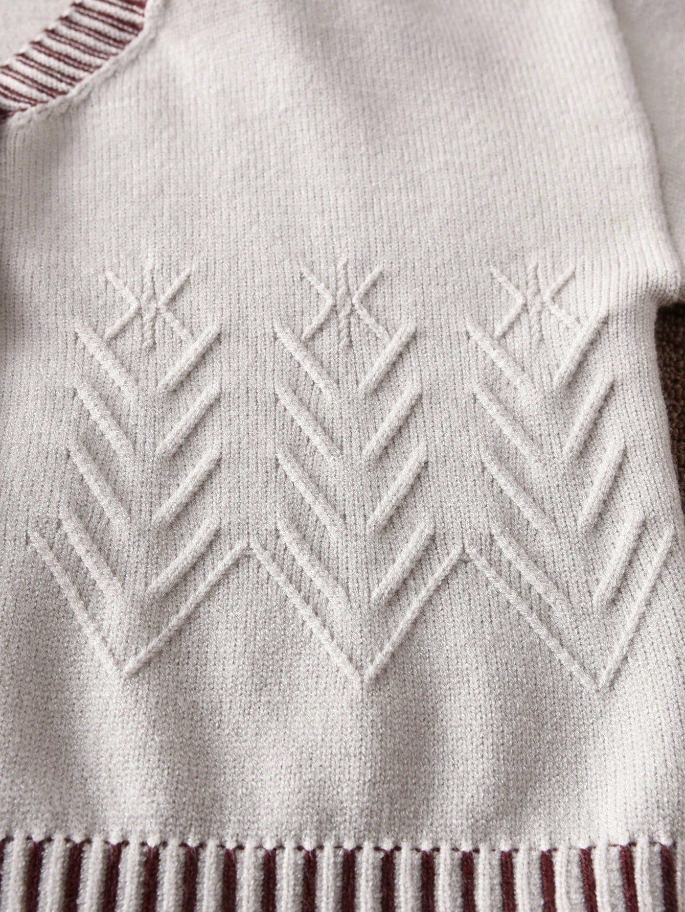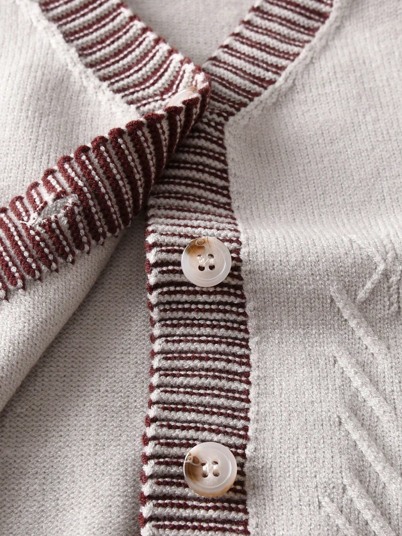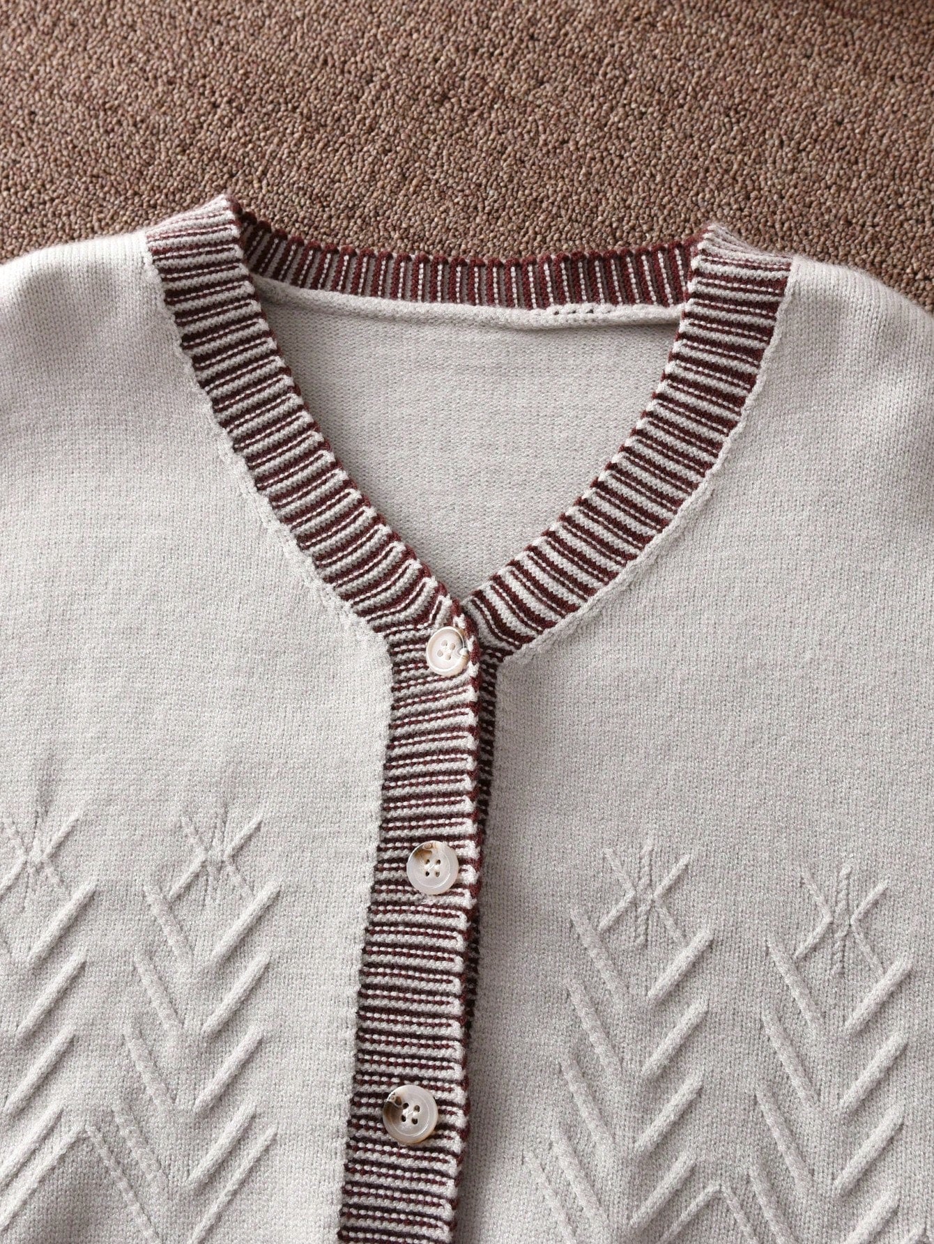 The cardigan is designed with a flattering V-neckline, button-front closure, and delicate textured knit detailing across the front. Contrast ribbed trim along the neckline, hem, cuffs, and pant hems adds visual interest and a refined finish. The pants feature a comfortable elastic waistband and a straight, easy drape for all-day wear. Finished in a soft cream tone with rich contrast accents, this set is ideal for lounging, travel, or casual styling.