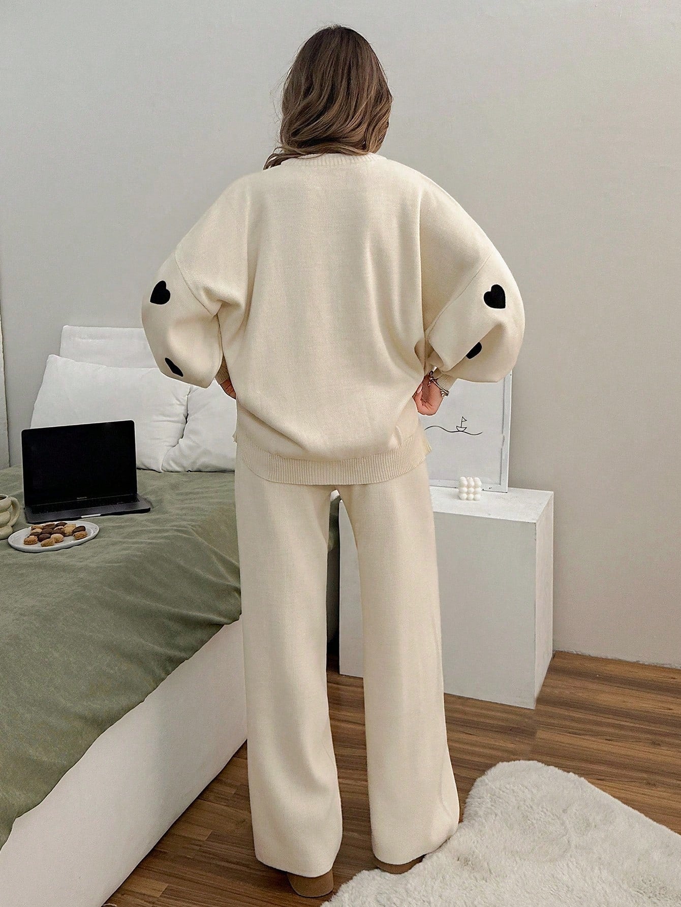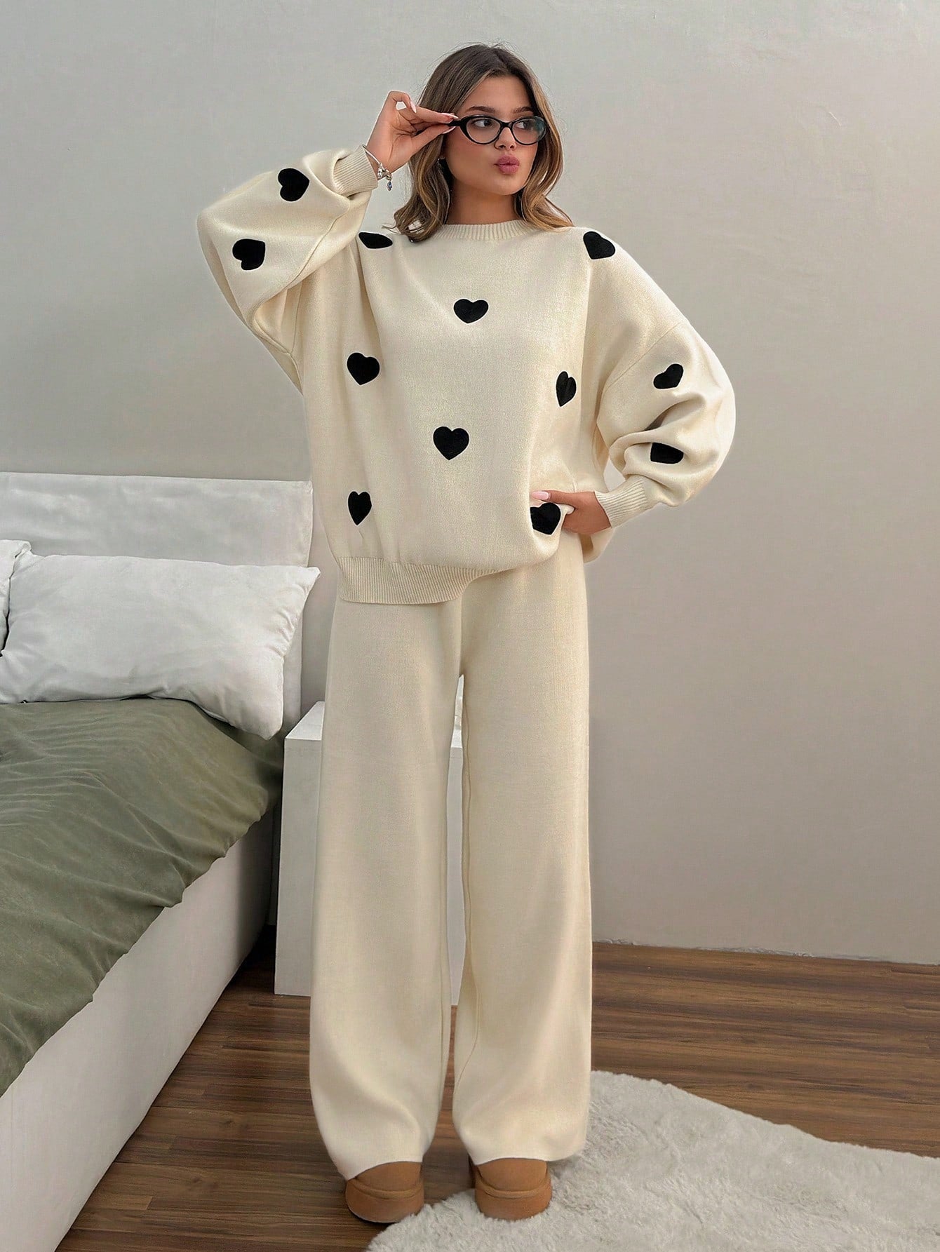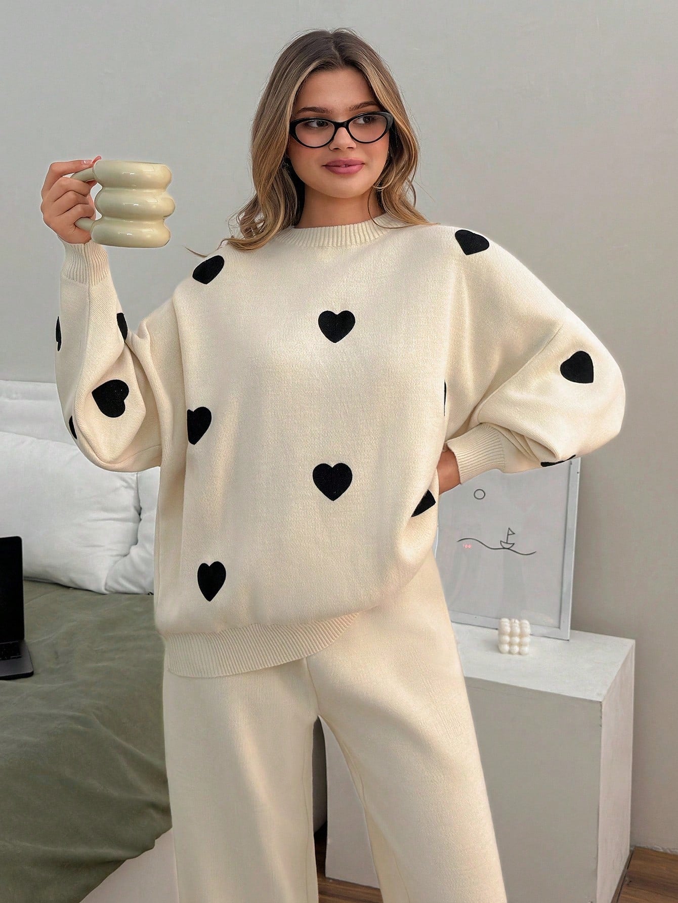 The sweater is designed with an allover scattered heart motif in bold black contrast, adding visual interest to the soft cream base. Voluminous sleeves and ribbed trim at the neckline, cuffs, and hem enhance the relaxed yet polished feel. The coordinating pants offer a smooth drape and comfortable fit, completing the look with ease and versatility. Perfect for cozy days at home or styled for casual outings, this set balances comfort with standout charm.