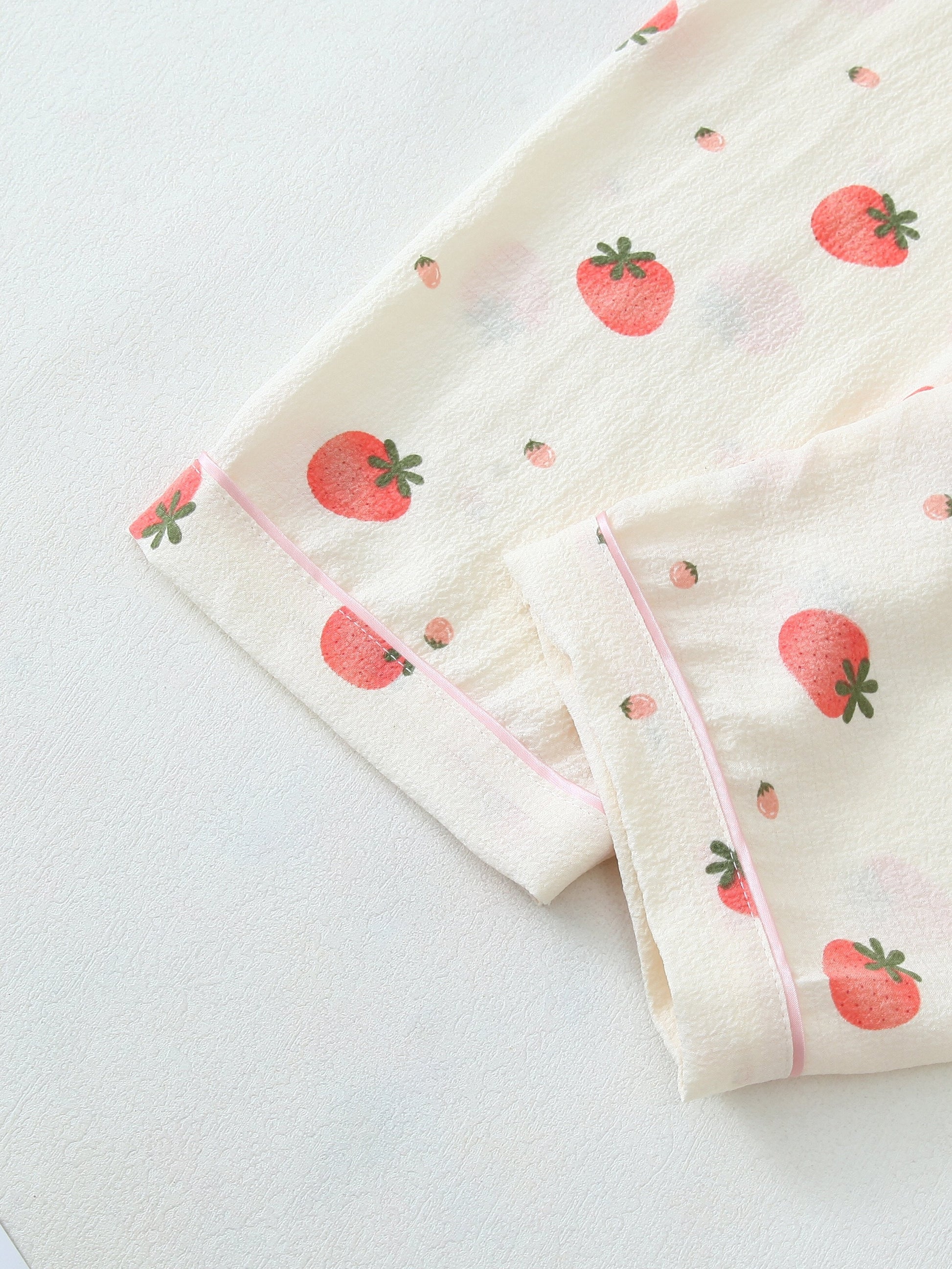 Sweet dreams are guaranteed with this strawberry print pajama set! Featuring cute strawberry patterns on a soft cream base with subtle pink piping, this set is the perfect mix of freshness and comfort.